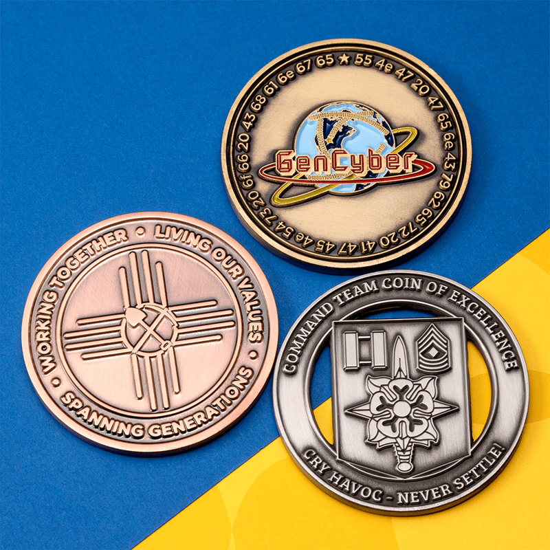 Antique plating is used to create a vintage appearance with a more textured surface. The darker metal creates a greater level of contrast between raised and recessed areas, so you don’t need to use enamel colors to make certain design elements stand out. Similar to high polish plating, the antique effect is created via electroplating coins made from brass or steel, and the result is a coin with classic appeal. If you’re looking for a design with a slightly better sense of depth and dimension, antique platting is an excellent option.