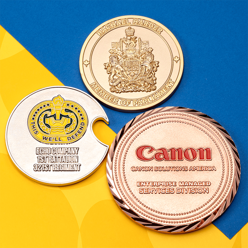 Choosing a metal plating style is the first step when creating a custom challenge coin design. Gold and silver are the most popular, but the options don’t stop there. We also have copper, nickel, and several colored metal options as well.