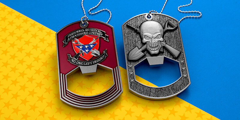 There’s such a strong association between dog tags and military units that they’re often overlooked as an option when crafting a custom design. But there are few things that perfectly capture a sense of belonging and camaraderie quite like a dog tag. We’ve helped military units create custom dog tags to boost morale and celebrate big moments, and they’re growing in popularity outside the military as well!